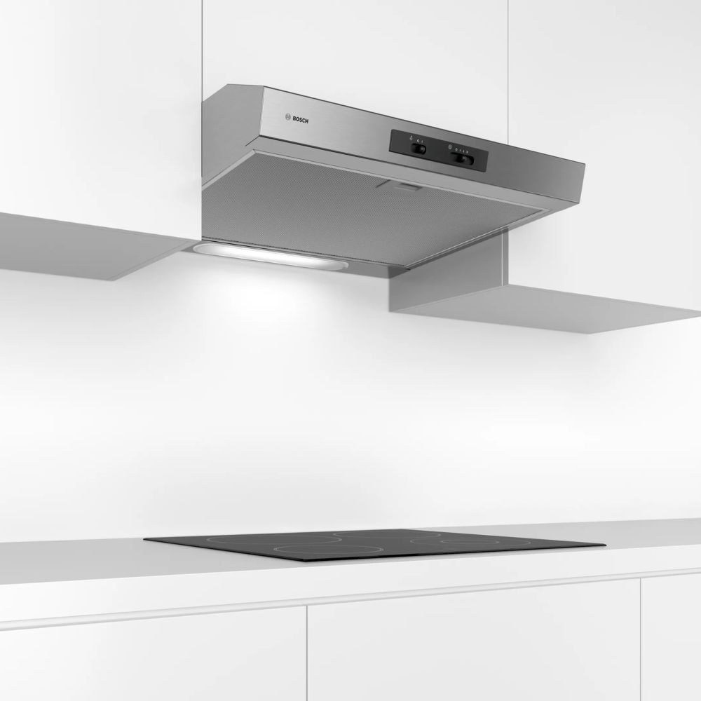 The Bosch DHU635HZA is a built-in under cupboard extractor hood with a metal grease filter.